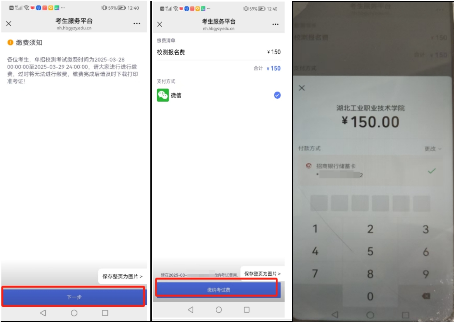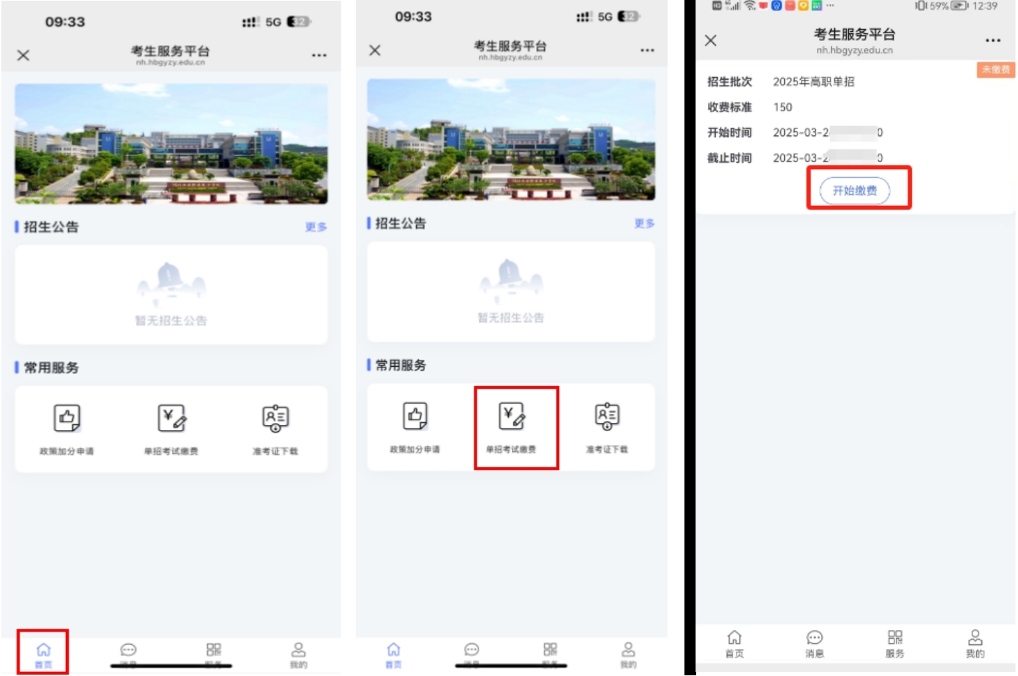 点击"必一(中国)"按钮回到主页,在"常用服务"里点击"单招考试缴费",进入缴费页面,如下图所示步骤顺序完成缴费: