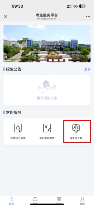 6.1点击"必一(中国)"按钮回到主页,在"常用服务"里点击"准考证下载",进入准考证页面,如下图所示: